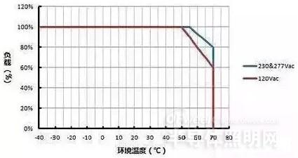 蓝色曲线则表示 LED 驱动器在输入 230Vac 或 277Vac 情况下,其负载随环境温度变化的功率降额曲线,其原理类同。