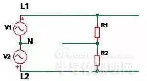 如上图所示,V1 表示第一相电压,V2表示第二相电压,R1 及 R2 分别表示正常安装到线路中的 LED 驱动器。当线路上零线(N)如图断开时,两个支路上的驱动器 R1,R2 相当于串联后接到 380Vac 电压上。因为输入内阻差异,当其中一个驱动器充电到启动时,内阻变小,电压可能大部分加到另外一个驱动器上,导致其过压损坏失效。