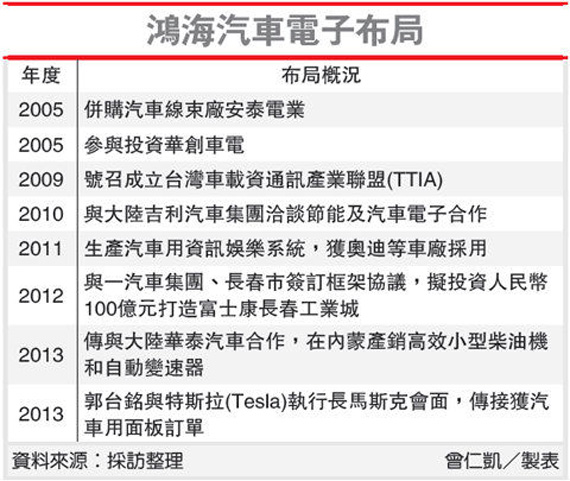 郭台铭对汽车产业一直情有独钟,将汽车电子(Car electronic)列为鸿海“7C”布局的重要一环,与计算机、消费性电子、通讯、内容、通路、生技医疗等其它6C并列。